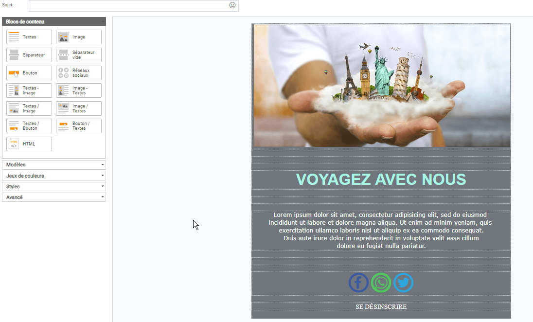 Uniformité: si vous générez des campagnes mensuelles pour signaler les mises à jour de vos services ou les actualités de votre secteur, le fait d’utiliser un modèle prédéfini vous permettra de conserver une ligne graphique standard et un design facilement identifiable pour vos abonnés. Lorsque vous travaillez avec un modèle, vous pouvez en créer un de base, puis simplement modifier les sections avec du nouveau contenu ou des images.