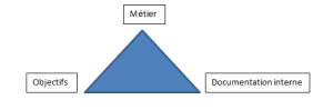 - Etude préalable : vous devez fixer quels seront vos objectifs à atteindre et avec quels moyens, c’est-à-dire avec quelles qualités de métier. Par ailleurs, les objectifs et les moyens sont définis grâce à la documentation interne établie à l’étape 2. Ces trois points sont liés entre eux, on peut les représenter comme suit :