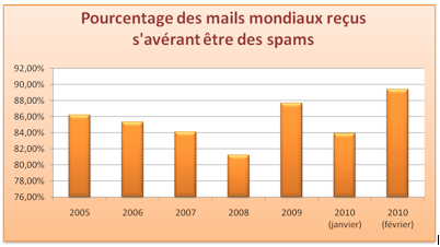 En référence au post sur les pays qui spamment le plus, je vais à présent vous donner les noms de ceux qui subissent le spam. Voici les chiffres que j’ai recueillis de différentes sources sur Internet pour l’année 2008-2009 : 81.2% des mails mondiaux reçus étaient des spams : 1ère place : Suisse avec 84.4% 2ème place : Chine (précisément la région de Hong Kong) avec 82.6% 3ème place : France avec 82.1% 4ème place : Israël avec 80.1% 5ème place : Autriche avec 76.6% Pour l’année 2009 : on constate une augmentation puisqu’on passe à 87.7% de spams avec un petit changement dans le classement. 1ère place : Danemark avec 88.2% 2ème place : Chine (précisément la région de Hong Kong) avec 87.6% 3ème place : France avec 87.4% 4ème place : Chine (hors Hong Kong) avec 86.9% 5ème place : Norvège avec 82.2% Pour ce début d’année 2010, au mois de janvier on obtient 83.9% et en février une forte hausse nous conduit à 89.4%. Voici une synthèse plus visuelle :