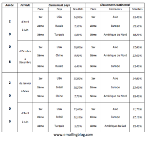 Vous en êtes très surement victime, vous passez vos journées à blacklister et il surcharge vos boîtes de réception… le SPAM. J’ai mené une petite enquête sur les pays qui spamment le plus (à l’échelle mondiale) et voilà ce qui est ressorti de mes investigations : tout d’abord, pour ceux qui aiment les chiffres, je vous conseille de jeter un coup d’œil au tableau ci-joint. C’est le classement des trois leaders du spam sur deux années passées (2008 et 2009), les chiffres indiquent ici le pourcentage de spams envoyé par chaque pays sur la totalité du spam mondial. Si vous voulez de plus amples informations, je vous conseille d’aller visiter le site de l’agence Sophos, qui tout au long de l’année publie des articles sur la sécurité informatique. On voit ici que la palme d’or revient à l’outre Atlantique, puisque les États-Unis conservent leur première place au fil du temps. Alors pourquoi un si triste score? Premièrement, avec l’apparition des réseaux sociaux (notamment les plus réputés qui sont américains), le spam s’est développé à cause de l’imprudence des gens. En effet, certaines personnes étalent en toute impunité leurs coordonnées, leurs préférences, etc.… sur le web. Par conséquent, il est plus facile pour les spammeurs de recueillir des informations et d’inonder les gens de pourriels. Or les Américains sont très friands de ces réseaux là, c’est comme ça qu’un spam sur six vient d’un ordinateur américain. Pour les autres places, la présence des pays de l’Est s’explique par le fait que beaucoup de spams traduisent dans ces contrées des trafics maffieux ou encore les activités illégales de certains groupuscules. Par ailleurs, en Russie par exemple, malgré les lois écrites, les sanctions prises contre les spammeurs sont pratiquement nulles. Au cours de l’année 2009, le Brésil entre en deuxième position, ce dernier souffre en effet d’un nouveau vecteur pour le spam, la hausse de cybercriminalité. C’est ainsi qu’entre dans le classement continental l’Amérique du Sud, car les pays comme la Colombie, le Brésil ou encore l’Argentine spamment de plus en plus. Elle n’apparaît pas dans le tableau (ce qui est d’ailleurs plutôt bon signe), mais qui de la France ? Il faut savoir qu’en 2005/2006 la France faisait partie des mauvais élèves, elle a même eu le bronze sur le podium. En 2008, la France n’était pas dans le top 12 et elle a reculé dans le classement 2009. Elle fait partie aujourd’hui des vingt premiers, mais stagne. Cela est certainement dû à l’absence d’une loi claire régissant le domaine du spam, mais ce problème est aussi européen. Par ailleurs, en Europe, il y a beaucoup de serveurs et donc le relais spam s’effectue plus facilement. En 2004, Bill Gates avait annoncé lors d’un discours qu’il ne restait que deux ans de vie au spam… Son estimation était erronée, car à moins d’une solution miracle, vous risquez de subir encore quelque temps des envois intempestifs. Il est également important dès lors que vous envoyez de nombreuses newsletter de bien choisir votre prestatire. Nous tenons à vous rappeler que Mailpro™ lutte activement contre le spam et vous garanti 99.995% de délivrabilité.